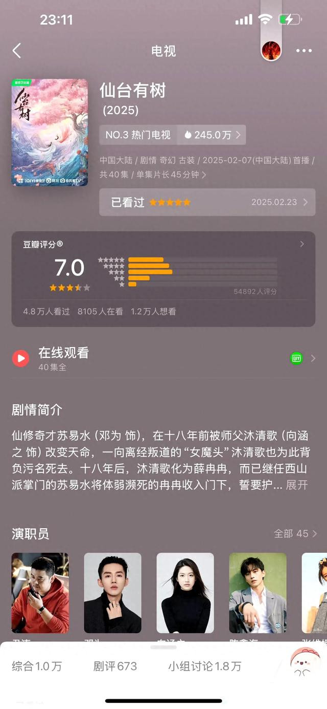 《仙台有树》能收获观众的青睐,靠的是实打实的硬实力。特效制作堪称一绝,构建出的仙侠世界美轮美奂,一招一式的法术特效都极为逼真,让观众仿佛置身于仙侠的奇幻世界之中。剧情更是跌宕起伏,巧妙的伏笔、揪心的虐恋、热血的成长,每一集都紧紧抓住观众的心,让人欲罢不能。演员们的出色演绎也为剧集增色不少,主角凭借细腻的情感诠释和扎实的演技,将角色的喜怒哀乐展现得淋漓尽致,配角们也都各有亮点,为整个故事增添了丰富的层次。